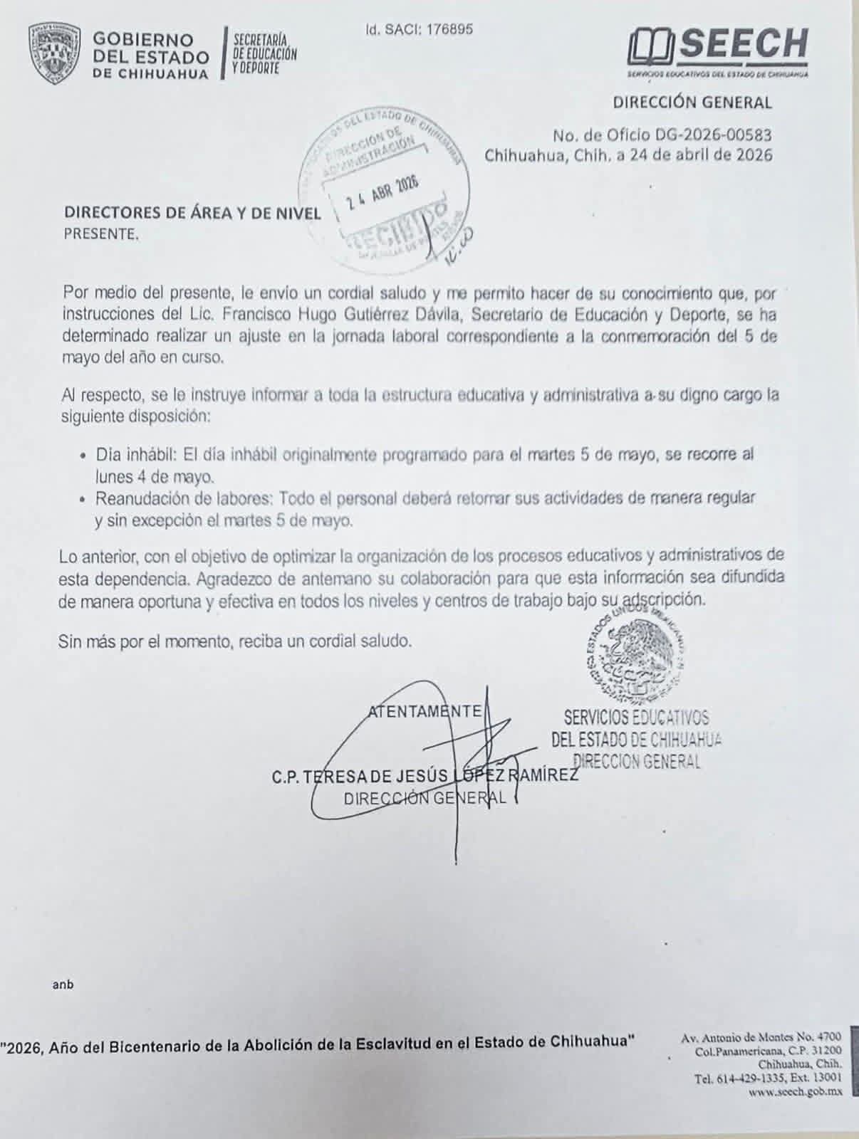 Estado Adelanta SEyD día inhábil por conmemoración del 5 de mayo en Chihuahua Contexto Norte MX 24/04/2026