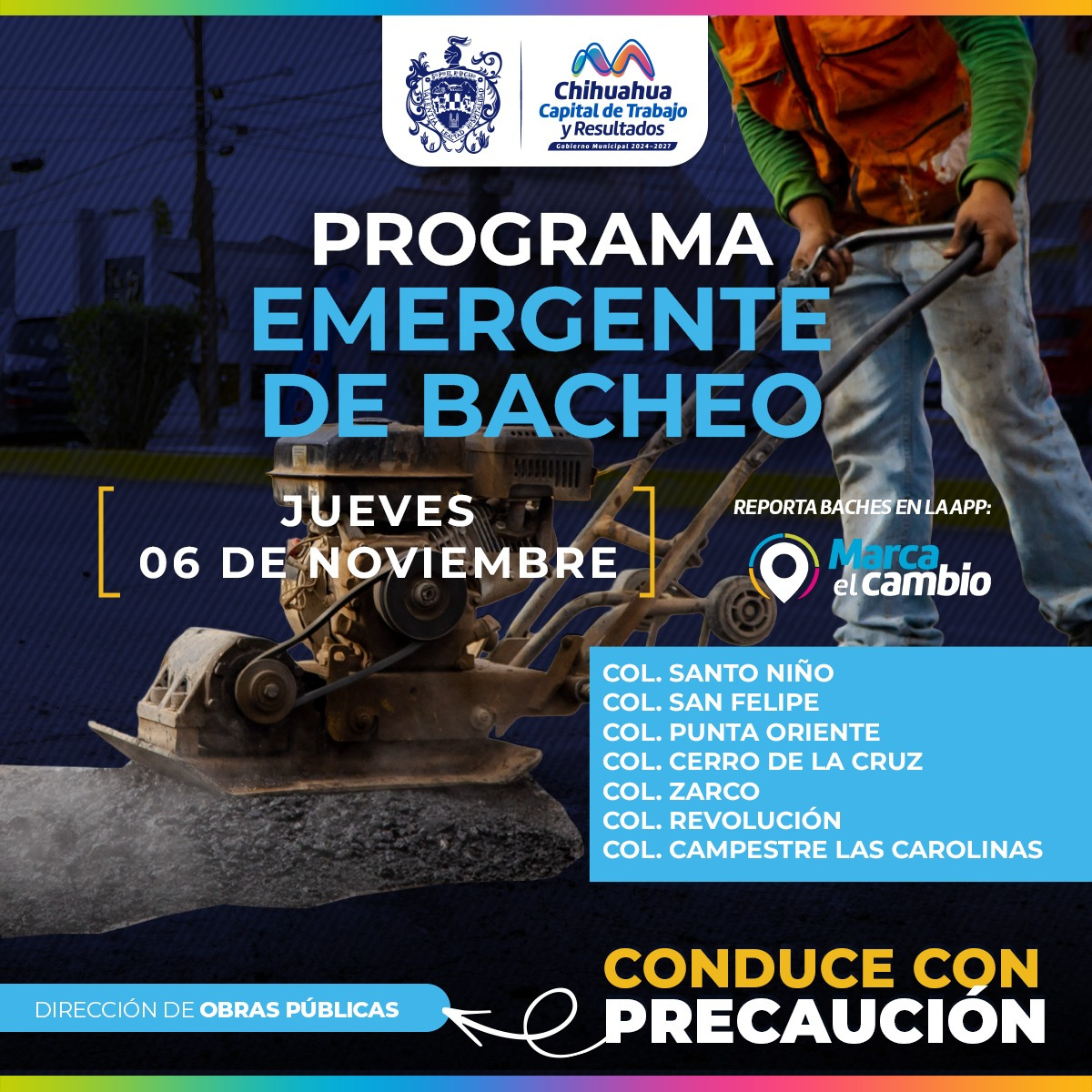 La DirecciĂłn de Obras PĂşblicas, bacheará este 6 de noviembre, mediante el programa emergente, calles…