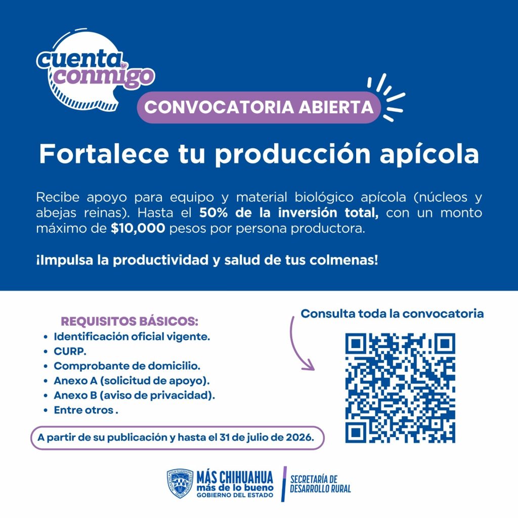 El Gobierno del Estado, a través de la Secretaría de Desarrollo Rural (SDR) informó a los apicultores chihuahuenses de la disponibilidad del esquema de Apoyos para Equipamiento e Infraestructura Rural, del programa Cuenta Conmigo en el Campo.