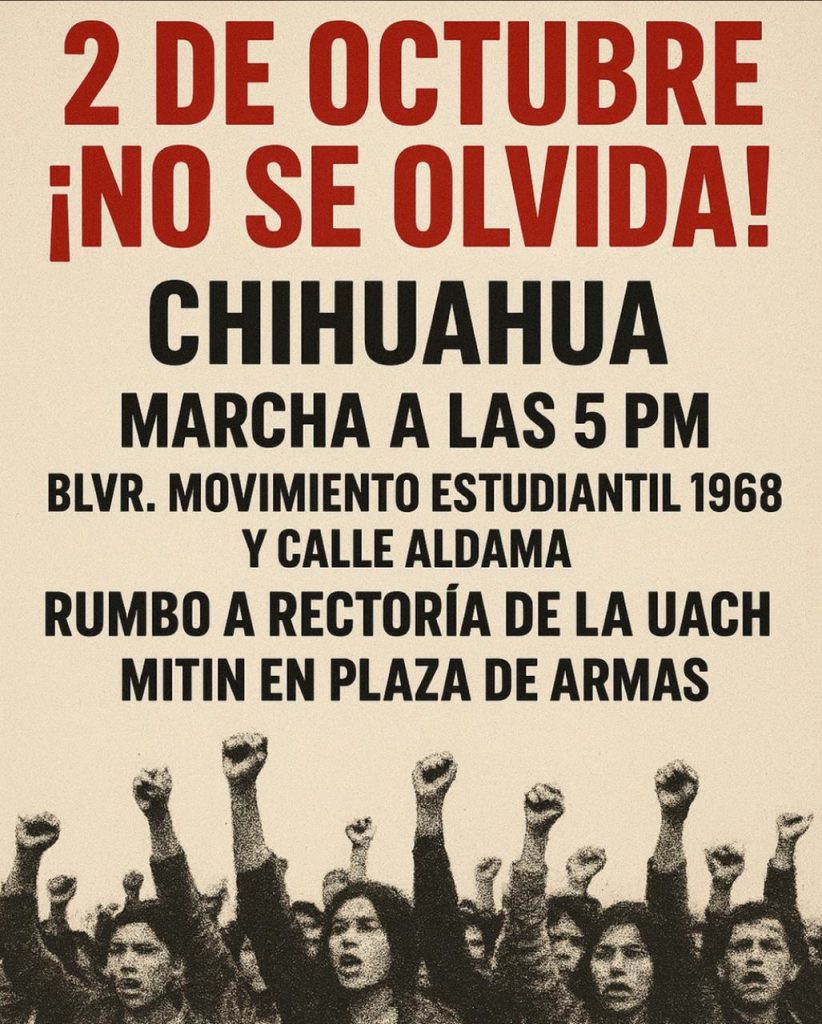 Tomé sus precauciones si transita por el centro de la ciudad. La marcha parte del bulevard Díaz Ordaz por la calle Aldama hasta la rectoria de la UACH a partir de las 5 de la tarde de este martes 2 de octubre.