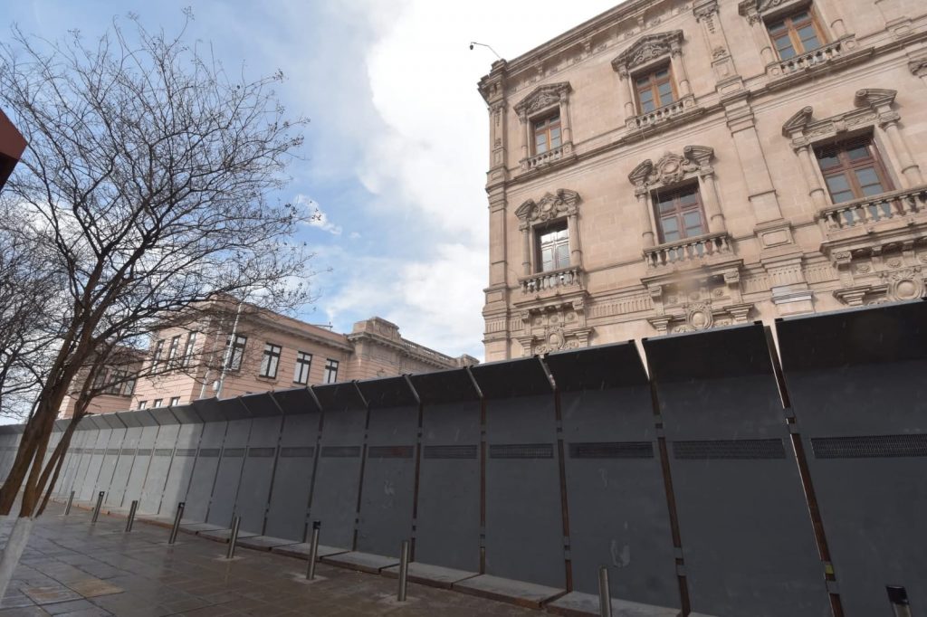 Una estructura amurallada rodea parte del primer cuadro de la ciudad, protegiendo diversos edificios públicos, que forman parte del patrimonio cultural de la ciudad de Chihuahua.