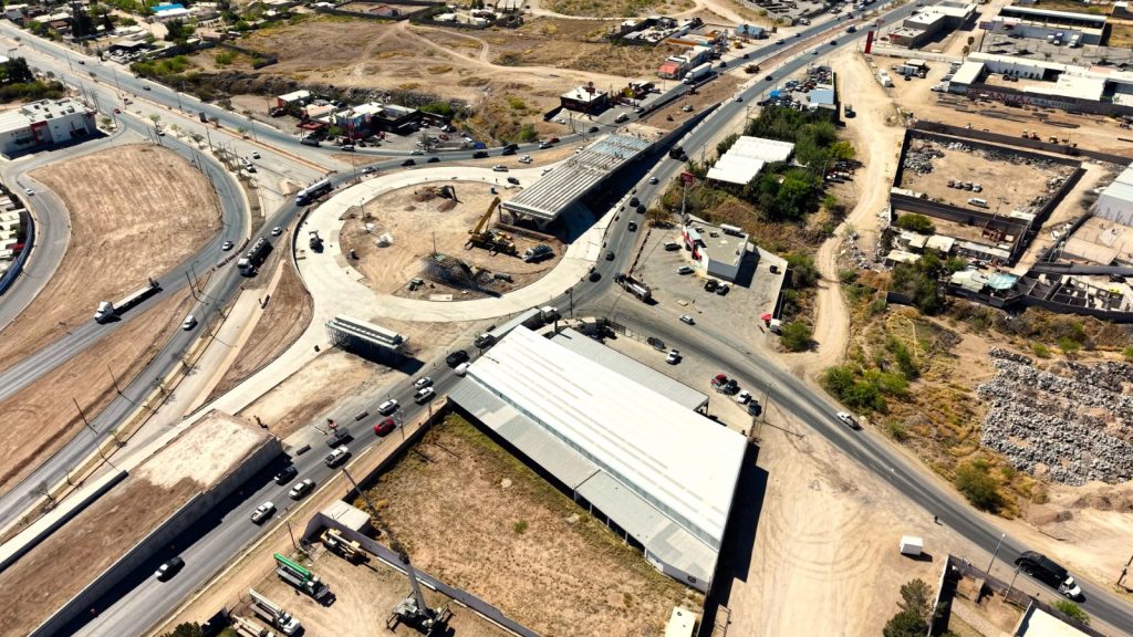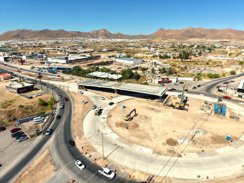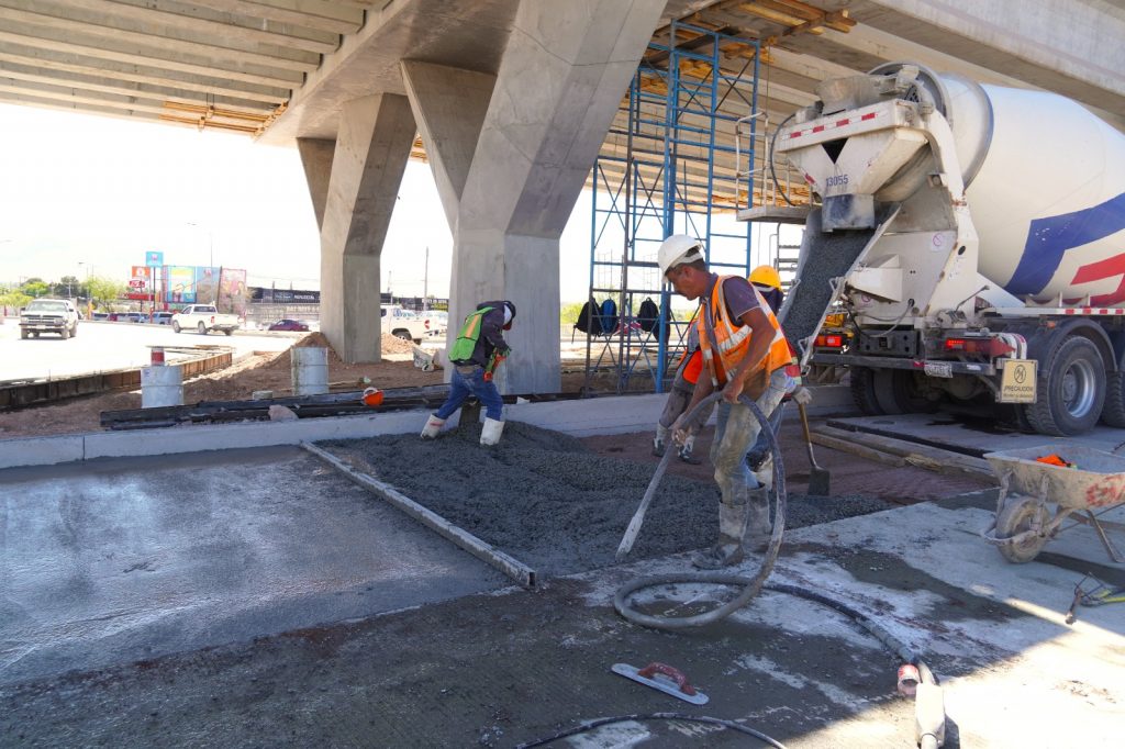 Como parte del plan estratégico de construcción, las cuadrillas de trabajo atienden diversos frentes de obra en las rampas de acceso, donde se realizan labores como el colado de parapeto, el tendido de base en el camellón del lado Chihuahua, además de la construcción de la caja captadora de agua pluvial, así como trabajos de colado en la glorieta, incluyendo la formación de guarniciones y banquetas.
