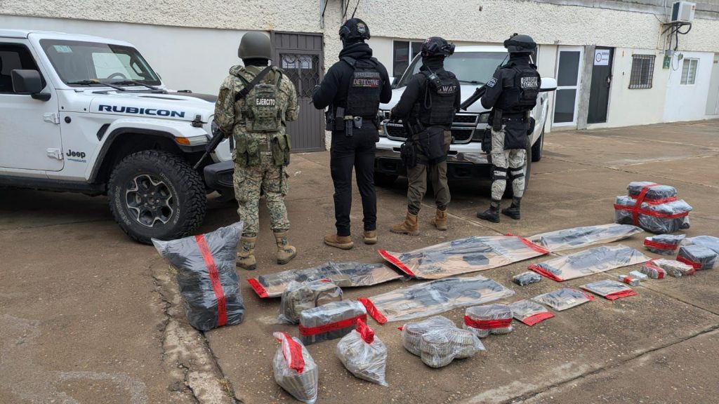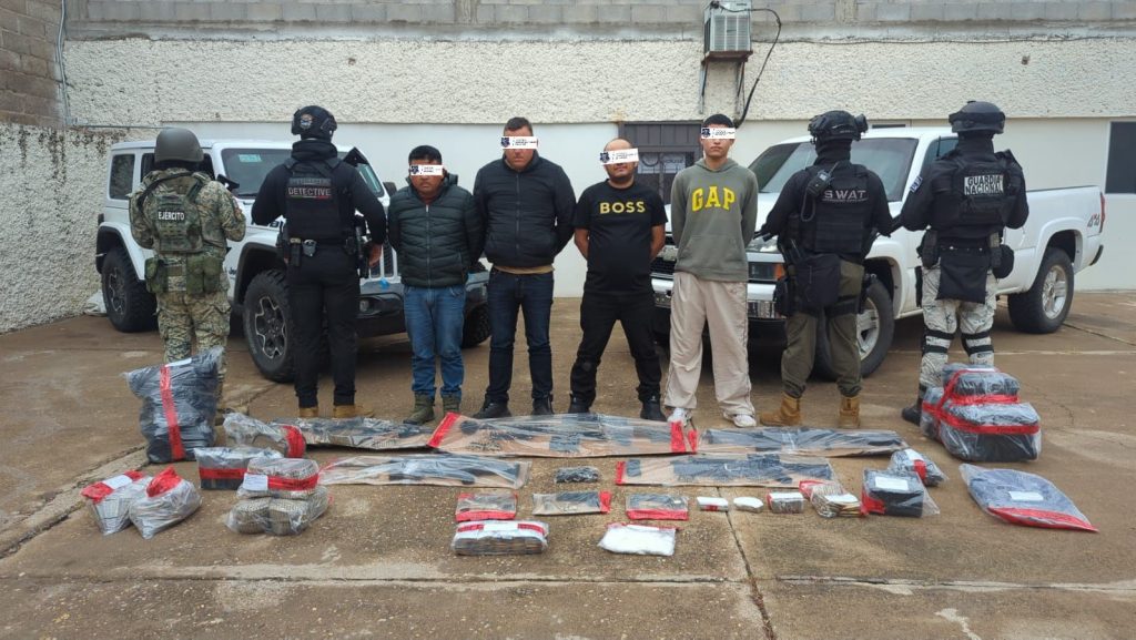 Asimismo, los sujetos portaban cuatro granadas, un dron con seis baterÃas, cuatro piezas de equipo táctico con placas balÃsticas, radios de comunicación, 186 dosis de presunta cocaÃna y un total de un millón 100 mil pesos en efectivo.
