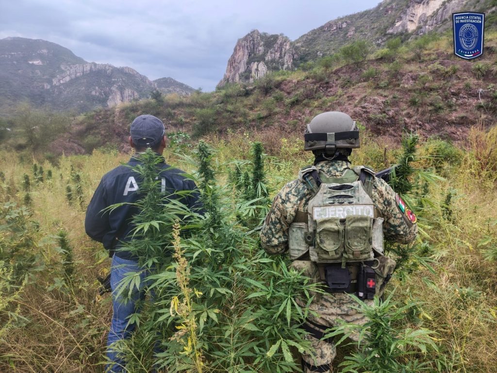 En un operativo conjunto, elementos de la Agencia Estatal de Investigación y del Ejército Mexicano, destruyeron tres plantíos de mariguana, en el lugar conocido como Cañón de los Remedios, municipio de Ocampo.