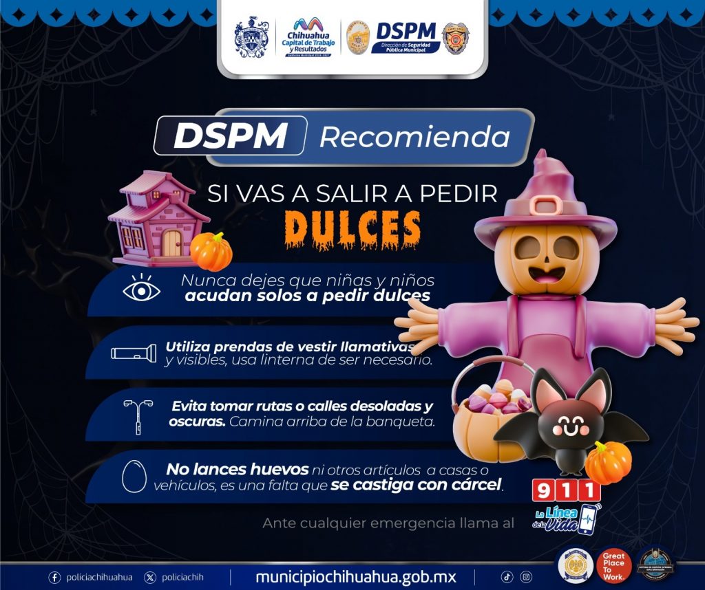 CHIHUAHUA, CHIH.- Ante la celebración de Halloween, la Dirección de Seguridad Pública Municipal (DSPM) ha anunciado un refuerzo significativo en los rondines de vigilancia para garantizar la seguridad de las familias este 31 de octubre, día en que miles de niños y niñas saldrán disfrazados a pedir dulces por las calles.