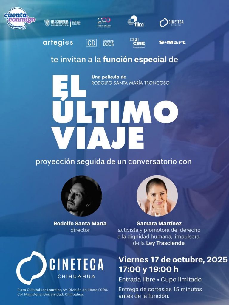 Tras la proyecciĂłn de #ElĂltimoViaje, su director Rodolfo Santa MarĂa y la activista Samara MartĂnez âimpulsora de la #LeyTransciendeâ abrirĂĄn un diĂĄlogo profundo sobre el derecho a decidir, el acompañamiento y la vida en su Ășltima etapa.