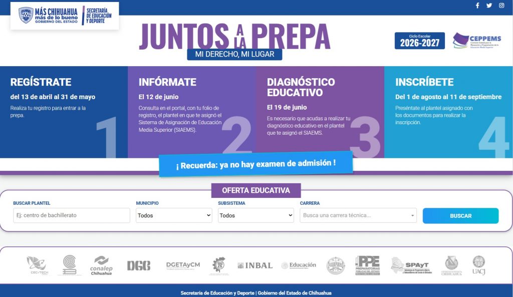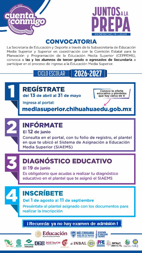 Del 13 de abril al 31 de mayo, el periodo de registro estará abierto a través de la página electrónica: https://mediasuperior.chihuahuaedu.gob.mx/, donde las y los aspirantes deberán seleccionar tres opciones de planteles que sean de su interés.