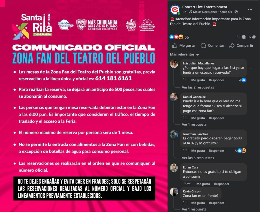 A pesar de que la publicidad oficial de la Feria de Santa Rita 2026 promociona las mesas de la Zona Fan del Teatro del Pueblo como «gratuitas», el reciente comunicado de los organizadores ha desatado una ola de quejas y críticas en redes sociales debido a la exigencia de un anticipo de 500 pesos para asegurar una reservación.