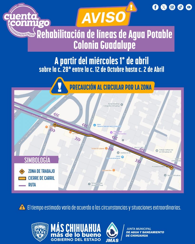 La Junta Municipal de Agua y Saneamiento (JMAS) de Chihuahua iniciará este miércoles 1 de abril los trabajos de rehabilitación de la red de agua potable en la colonia Guadalupe, para mejorar el servicio que se brinda a la ciudadanía.