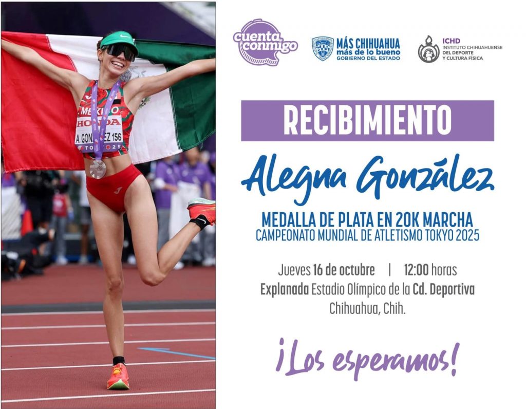 El Instituto Chihuahuense del Deporte invita a recibir a la subcampeona mundial de 20k marcha, Alegna González, este jueves a las 12:00 del mediodía en la explanada del Estadio Olímpico de la Ciudad Deportiva.
