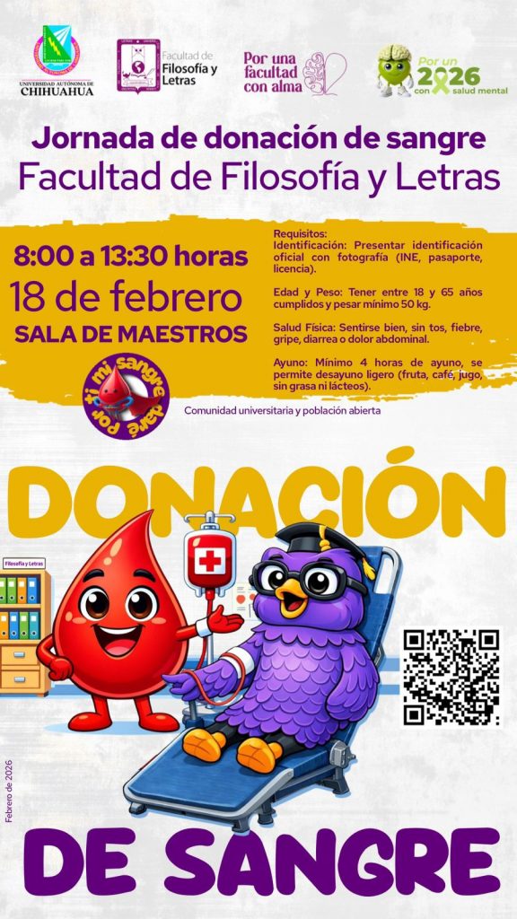A partir del 18 de febrero, la Facultad de Filosofía y Letras de la UACH llevará a cabo la Jornada de Donación “Mi sangre por ti daré”, actividad solidaria para fortalecer el autocuidado y la responsabilidad social a través de acciones que salvan vidas.