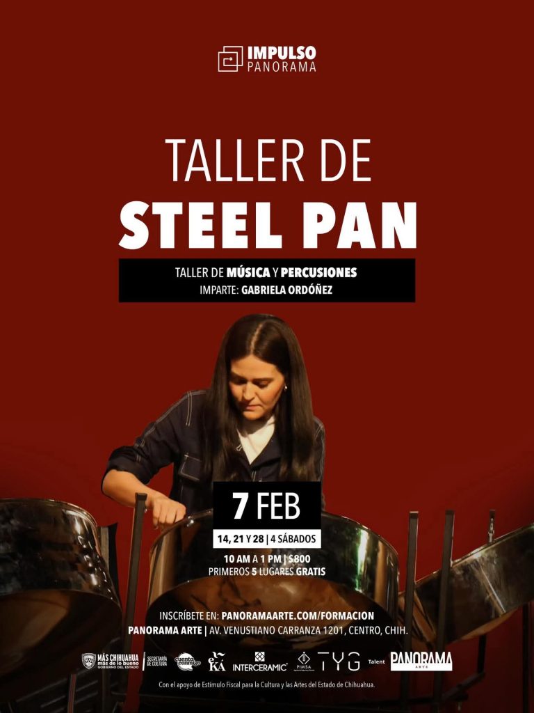 Con el apoyo del Estímulo Fiscal para la Cultura y las Artes del Estado de Chihuahua, Pathos Danza Contemporánea anuncia la apertura de lugares para el taller de Steel PaN impartido por Gabriela Ordoñez los días 7, 14, 21 y 28 de febrero con un costo de 800 pesos, ofreciendo los cinco primeros lugares de manera gratuita.