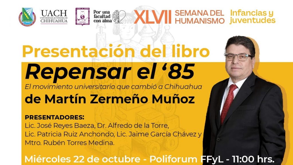 El próximo miércoles 22 de octubre a las 11 de la mañana en el poliforum de la Facultad de Filosofía y Letras de la UACH, se presentará el libro Repensar el 85, el movimiento que cambio a Chihuahua del Dr. Martín Antonio Zermeño Muñoz.