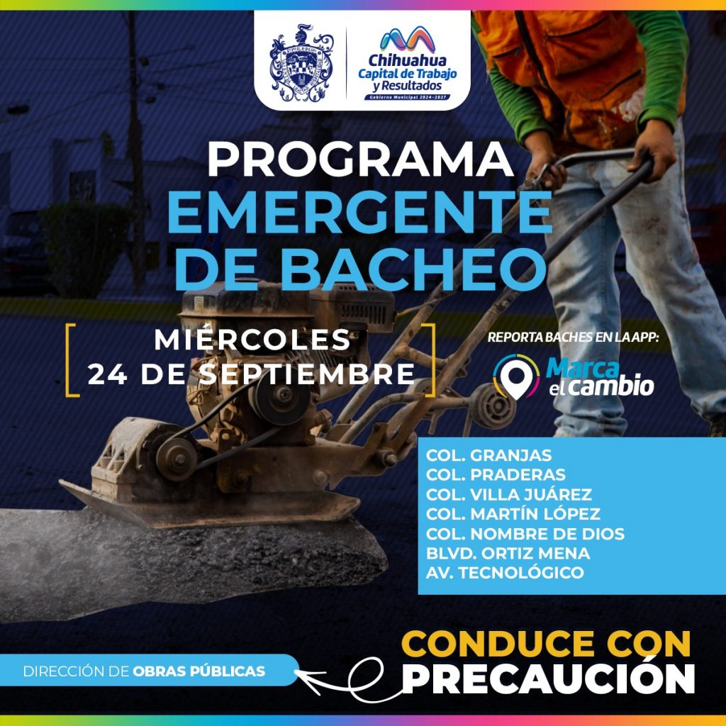 El municipio de Chihuahua anuncio que el día de hoy realizará tarea de bacheo emergente en las colonias Granjas, Praderas, Villa Juárez, Martín López y Nombre de Dios, así como en el bulevar Ortiz Mena y en la avenida Tecnológico a través de la Dirección de Obras Públicas.