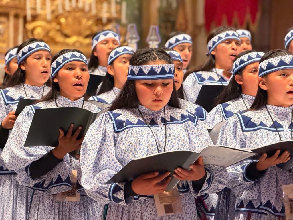 El Coro de Niñas del Albergue Yermo y Parres de Carichí interpretó cantos navideños en español y rarámuri, llevando la voz, la fuerza y la esperanza de nuestros pueblos originarios hasta este recinto espiritual, en un año dedicado en México a las mujeres indígenas.