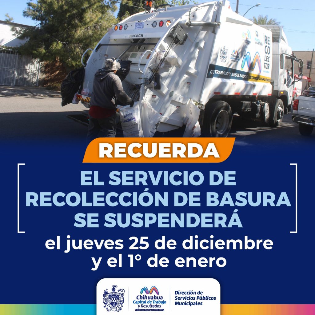 Con motivo de la celebración de las fiestas decembrinas, el Gobierno Municipal, a través de la Dirección de Servicios Públicos Municipales recuerda a la población en general que los días 25 de diciembre y 1 de enero, el servicio de recolección de basura se suspenderá.