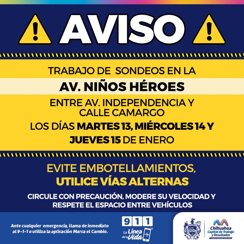 Debido a lo anterior el municipio informó que a partir del martes martes 13 al jueves 16 de enero, el Fideicomiso del Centro Histórico llevará a cabo trabajos de sondeo sobre la avenida Niños Héroes, entre avenida Independencia y calle Camargo, por lo que se hace un atento llamado a la ciudadanía para tomar precauciones al transitar por la zona.