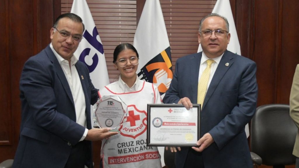 Como muestra de agradecimiento, la Cruz Roja entregó a la UACH el “Distintivo Diamante”, una de sus máximas distinciones institucionales, por la confianza y colaboración sostenida en programas y servicios que impactan directamente en la comunidad.