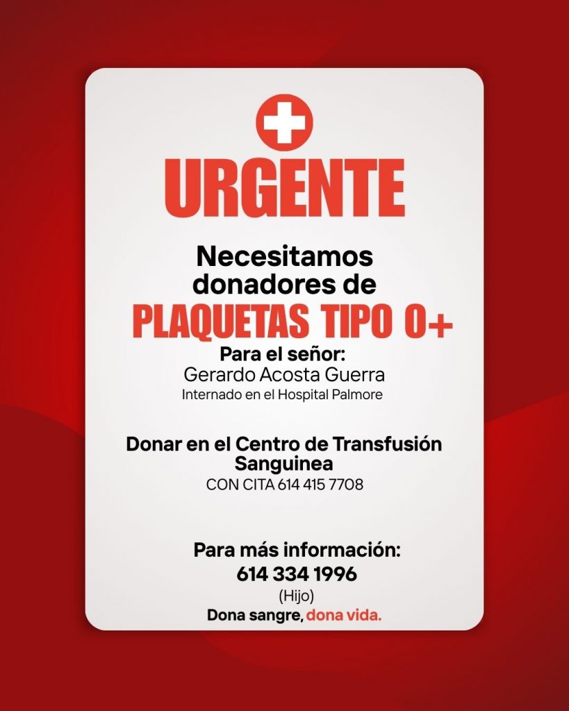 Urgente necesitamos donadores de plaquetas tipo O+